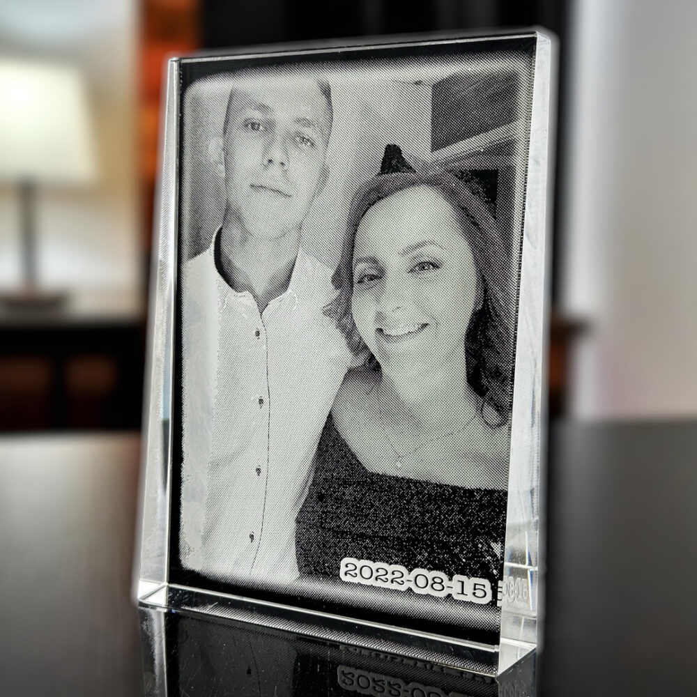 Ant foto kristalo ANGEL galime graviruoti artimo žmogaus portretą, vardą, datą, palinkėjimą ar simbolinį tekstą – tai išskirtinis būdas išreikšti jausmus ypatingai progai.