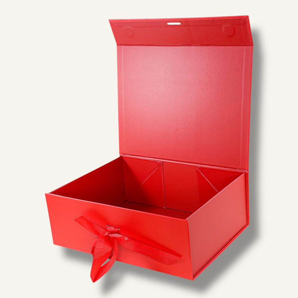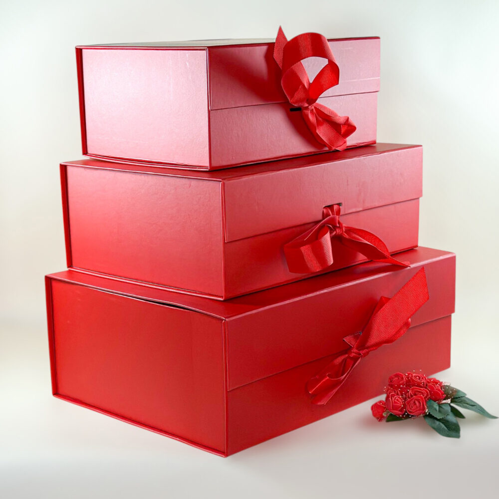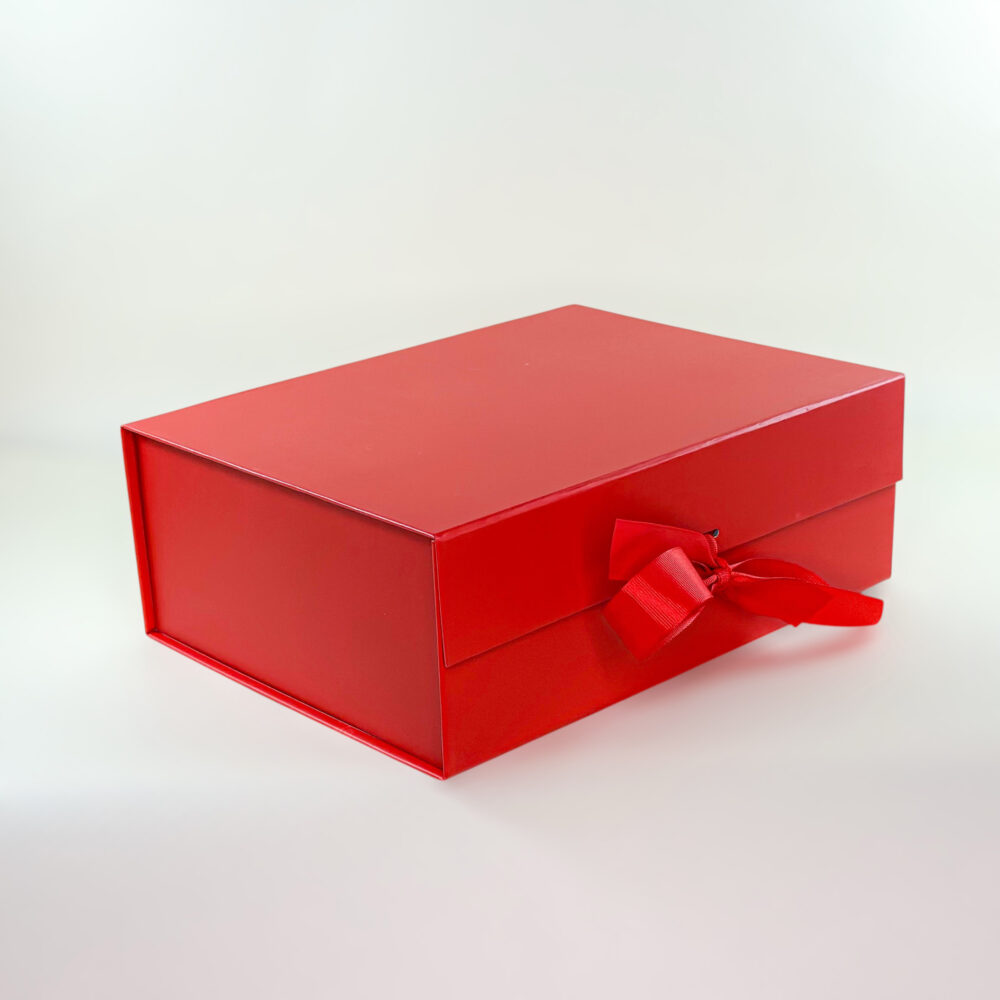 Raudona sulankstoma dovanų dėžutė M su kaspinu