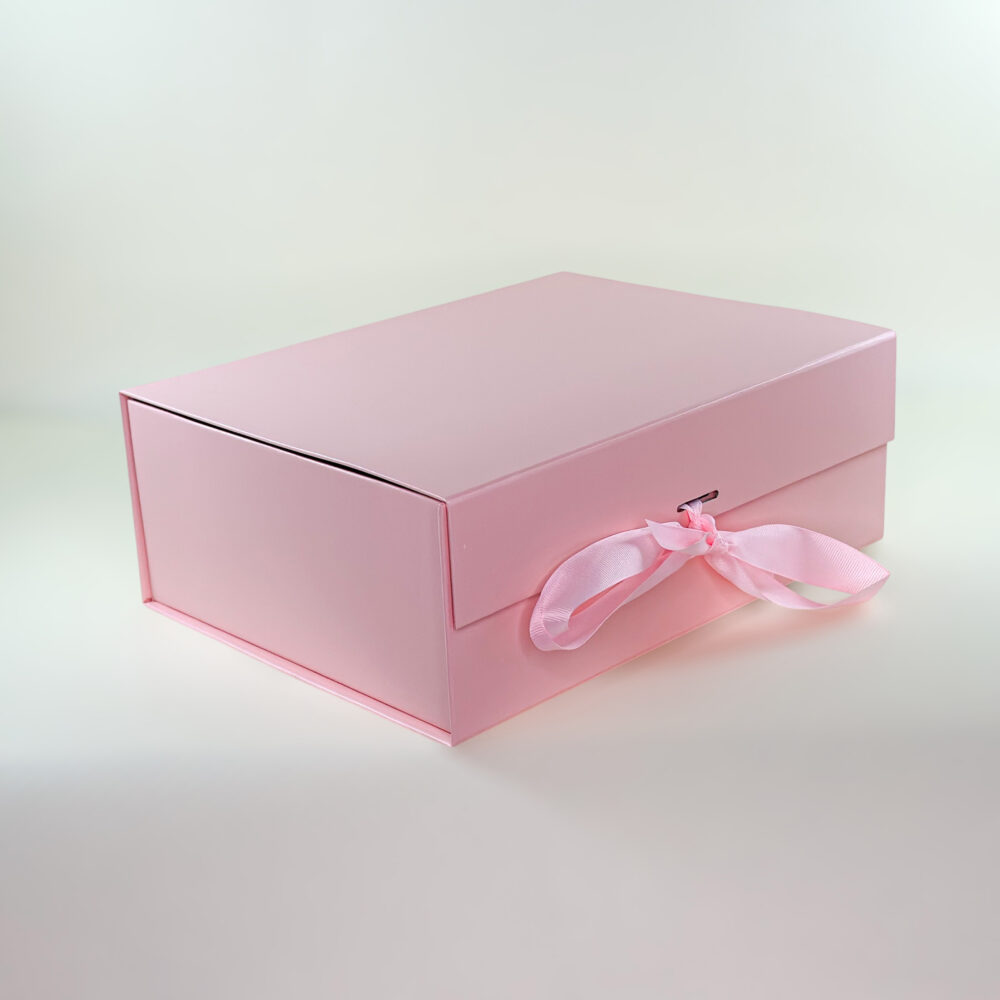 Rožinė sulankstoma dovanų dėžutė M su kaspinu