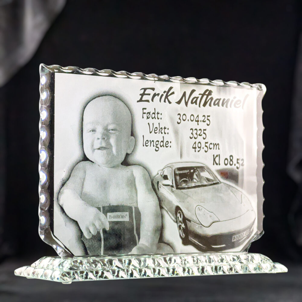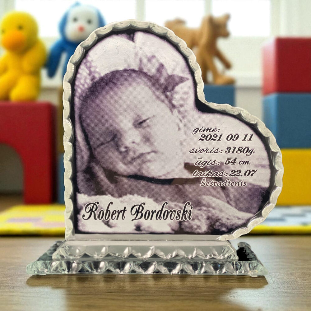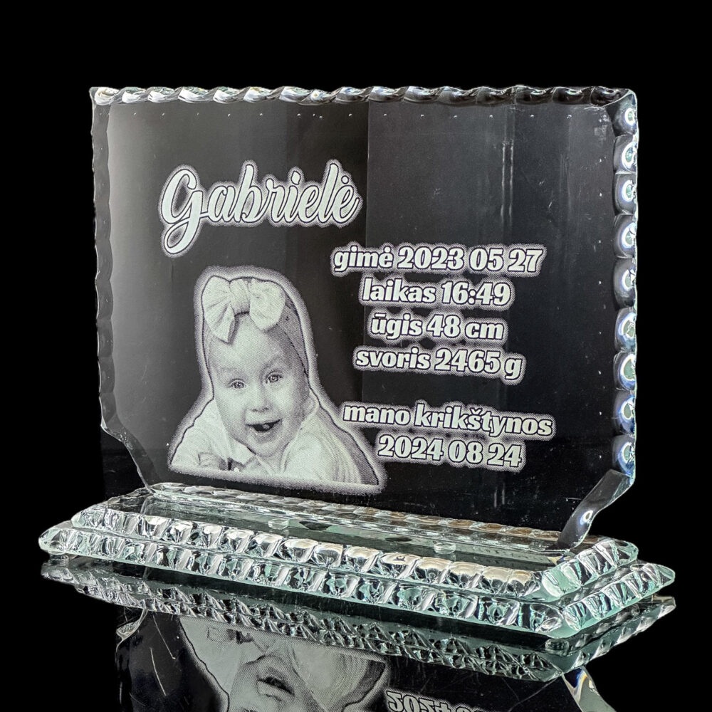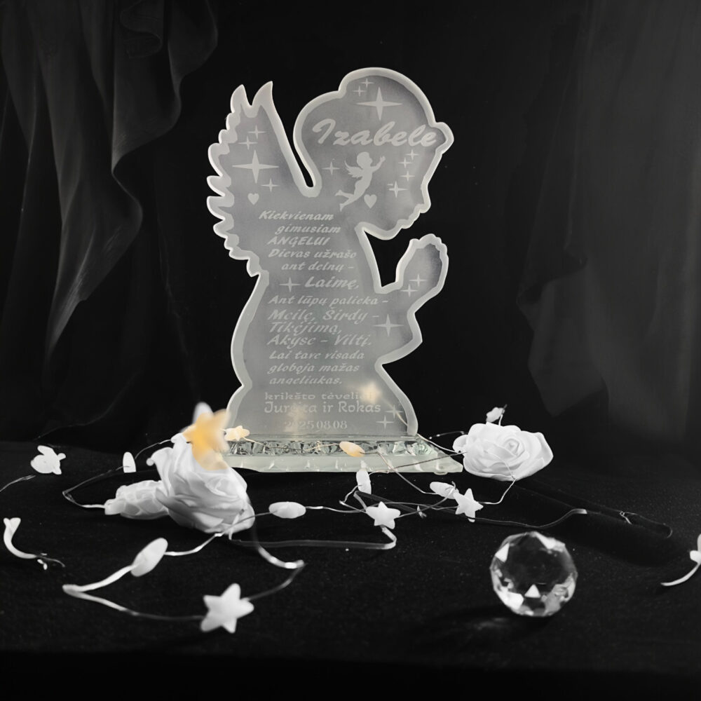 stikliniam stovui „ANGELAS“ Graviruoti galima kūdikio vardą, gimimo datą, laiką, ūgį, svorį, krikštynų datą, tėvų ar krikštatėvių vardus, palinkėjimus bei simbolinius žodžius. Šis angelo formos stiklinis stovas ypač tinka krikštynoms ar vaikų gimimo progai įamžinti.