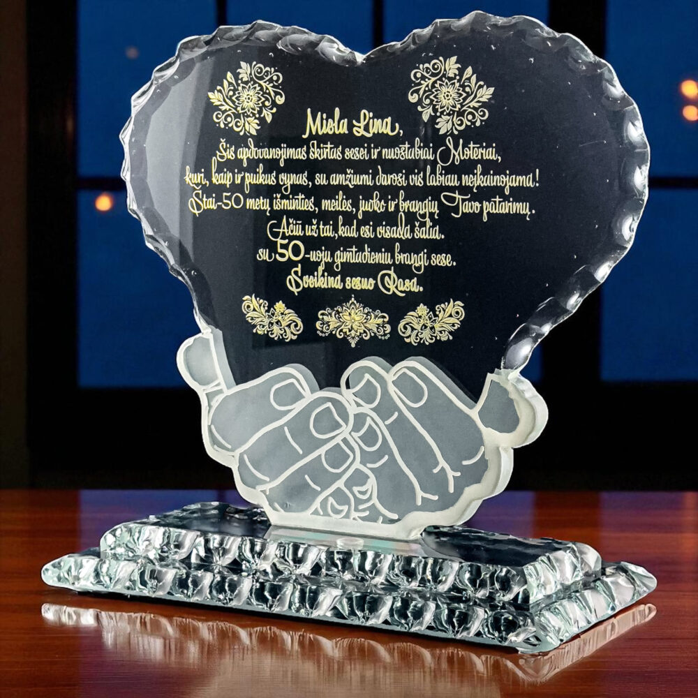 Sukurkite išskirtinį stiklinį apdovanojimą su individualia graviruote – nuo pirmos idėjos iki prabangaus įteikimo.